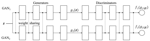 另外上节中提到了Co-Training,感觉这里也应该提一下CoGAN[14],因为名字有些相似,并且也可以用于未配对的图像翻译。CoGAN的大体思想是:如果两个Domain之间可以互相映射,那么一定有一些特征是共有的。比如男人和女人,虽然普遍可以从长相区分,但不变的是都有两个眼睛一个鼻子一张嘴等等。所以可以在生成的时候,把生成共有特征和各自特征的部分分开,示意图如下: