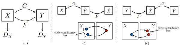 X和Y分别是两种不同类型图的集合,比如穿衣服的女优和没穿衣服的女优。所以给定一张穿了衣服的女优,要变成没穿衣服的样子,就是个图片翻译问题。CycleGAN示意图中(b)和(c)就是Dual Learning: