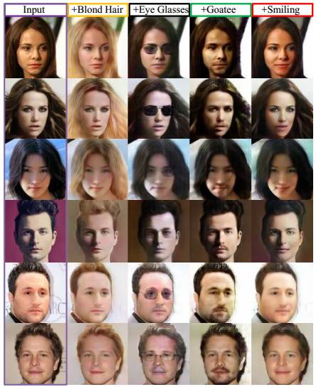 其实就是两个GAN结构,其中生成网络和判别网络中比较高层的部分都采用了权值共享(虚线相连的部分),没有全职共享的部分分别处理不同的domain。这样每次就可以根据训练的domain生成一个样本在两个domain中不同的对应,比如戴眼镜和没戴眼镜: