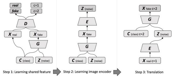 第一步用噪声Z作为和domain无关的共享表征对应的latent noise,domain信息作为条件C训练一个C-GAN。第二步,训练一个encoder,利用和常见的encode-decode结构相反的decode(generate)-encode结构。学习好的encoder可以结合domain信息,把输入图像中和domain无关的共享特征提取出来。第三步,把前两步训练好的encoder和decoder(generator)连一起,就可以根据domain进行图像翻译了。