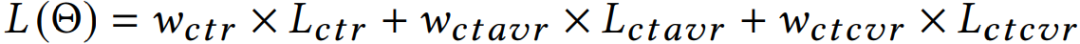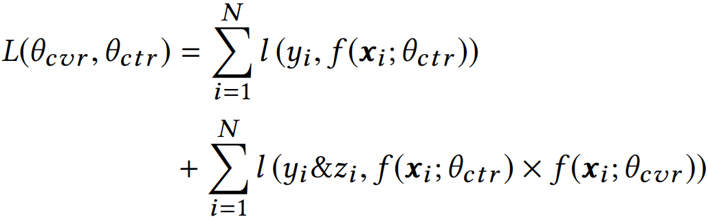 由上面的式子可知,pCVR 可通过 pCTR 和 pCTCVR 推导出来,那么我们只需要关注 pCTR 和 pCTCVR 两个任务即可,并且 pCTR 和 pCTCVR 都可以从整个样本空间进行训练?为什么呢,因为对于 pCTR 来说可将有点击行为的曝光事件作为正样本,没有点击行为的曝光事件作为负样本,对于 PCTCVR 来说,将同时有点击行为和购买行为的曝光事件作为正样本,其他作为负样本。模型的 loss 函数: