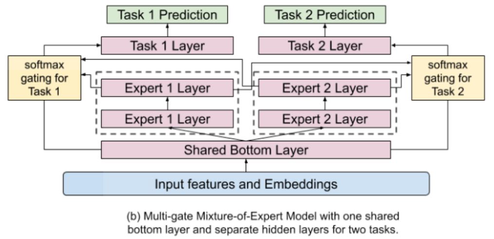 ❸ 通过 Multi-gate Mixture-of-Experts ( MMoE ) 这种特殊的多任务结构来学习出不同任务的权重,比如 YouTube 的多任务模型。