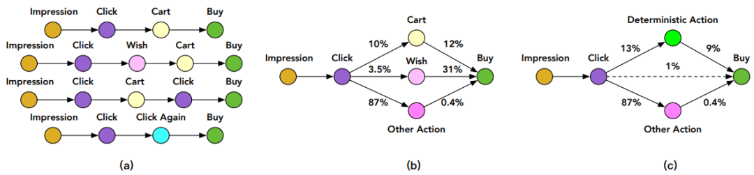 文中把加购物车或者心愿单的行为称作 Deterministic Action ( DAction ),表示购买目的很明确的一类行为。而其他对购买相关性不是很大的行为称作 Other Action ( OAction )。那原来的 Impression→Click→Buy 购物过程就变为: