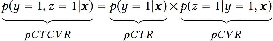 ESMM 模型由两个子网络组成,左边的子网络用来拟合 pCVR,右边的子网络用来拟合 pCTR,同时,两个子网络的输出相乘之后可以得到 pCTCVR。因此,该网络结构共有三个子任务,分别用于输出 pCTR、pCVR 和 pCTCVR。假设用 x 表示 feature ( 即 impression ),y 表示点击,z 表示转化,那么根据 pCTCVR = pCTR * pCVR,可以得到: