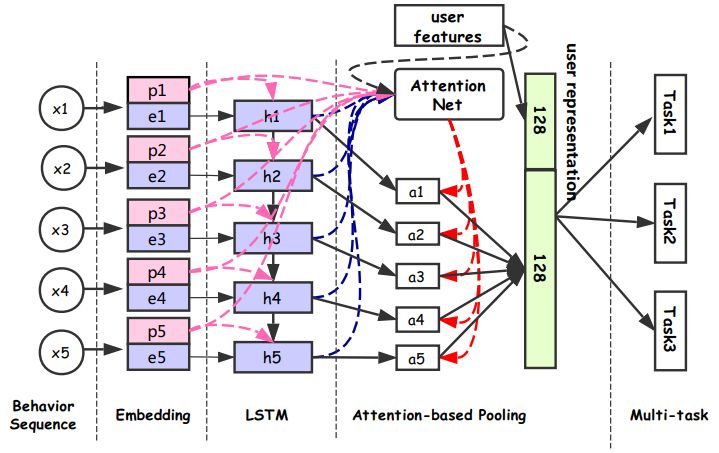 模型分为行为序列层、Embedding 层、LSTM 层、Attention 层、下游多任务层。