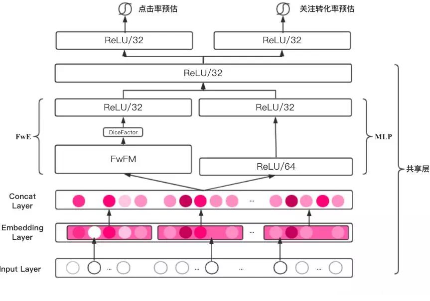 根据业务目标,将点击率和下单率拆分出来,形成两个独立的训练目标,分别建立各自的 Loss Function,作为对模型训练的监督和指导。DNN 网络的前几层作为共享层,点击任务和下单任务共享其表达,并在 BP 阶段根据两个任务算出的梯度共同进行参数更新。网络在最后一个全连接层进行拆分,单独学习对应 Loss 的参数,从而更好地专注于拟合各自 Label 的分布。