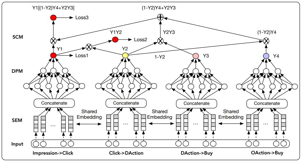Impression→Click→DAction/OAction→Buy 的概率,pCTCVR = CTR * CVR = Y1 * [(1 - Y2) * Y4 + Y2 * Y3],由四个网络的输出共同得到。其中 CVR=(1 - Y2) * Y4 + Y2 * Y3。是因为从点击到 DAction 和点击到 OAction 是对立事件。
