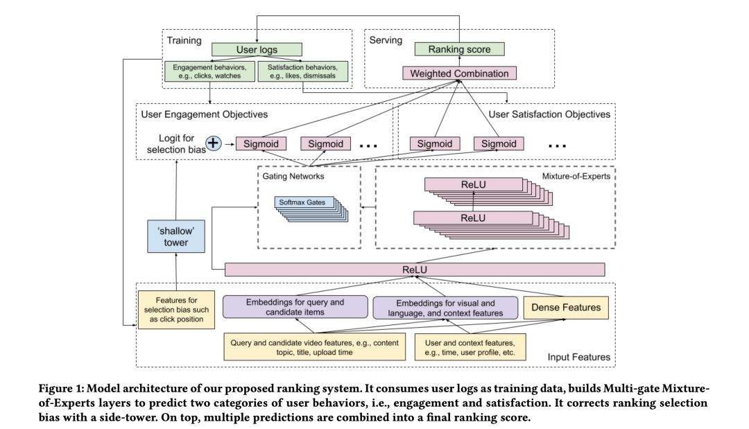 ❶ 视频推荐中的多任务目标。比如不仅需要预测用户是否会观看外,还希望去预测用户对于视频的评分,是否会关注该视频的上传者,否会分享到社交平台等。