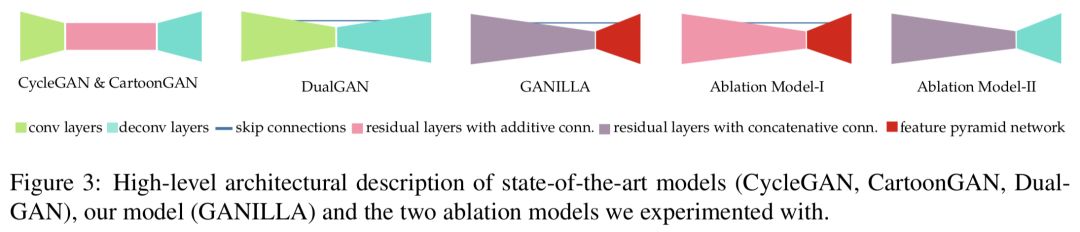 下面图3展示了文章的生成器网络 GANILLA 的简要架构描述,以及当前的 state-of-the-art 模型和两个对比实验模型。从图中可以看出,使用卷积层进行下采样再使用去卷积层进行上采样是一种常见的策略。除了 DualGAN之外,CycleGAN 和 CartoonGAN 在下采样和下采样层之间还有额外的带有加性连接 (additive connections) 的残差层。在文章的模型中,作者使用带有拼接连接 (concatenative connections) 的残差层,并使用上采样算子代替反卷积层。两个对比模型的目的在于理解下采样和上采样部分低层特征的效果。第一个对比模型将拼接连接替换为加性连接,以观察下采样部分低层特征的重要性。第二个对比模型将 GANILLA 的上采样层替换为 CycleGAN 的上采样层,以测试上采样部分低层特征的有效性。