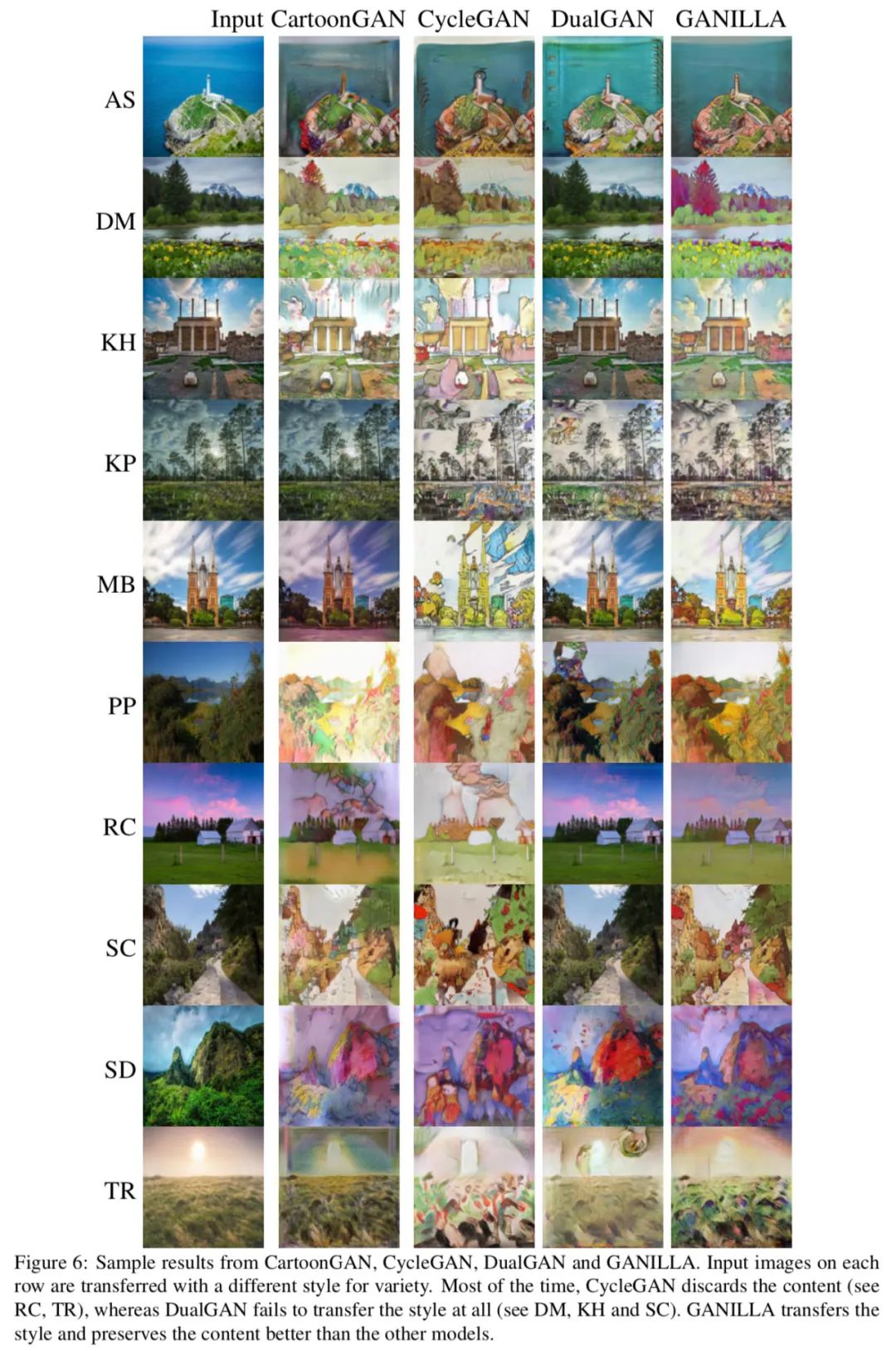 下面图6针对每个插图艺术家,输入相同图片,CartoonGAN、CycleGAN、DualGAN 和本文的 GANILLA 分别生成的结果,只有本文方法能够在保留输入图片内容的前提下成功地迁移了风格。