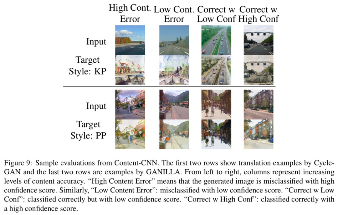 为了评估输入内容的保留程度,作者提出了内容分类器 Content-CNN,这里内容被定义为属于特定场景类别,如森林、街道等。作者从 SUN 数据集选取了10个与自然图像数据集中内容接近的户外类别,作为负类,作者使用除了训练集中使用的10个插图艺术家的作品外的所有插图。作者的直觉是,如果能够保留内容,风格化后的自然图像应该仍然具有相同的内容,例如如果以高尔基-保罗风格生成山峰图像,仍然应该能够将其分类为山峰。如果生成的图像失去了与内容的联系,则可以将其归类为插图即负类。图9展示了一些 CycleGAN 和 GANILLA 生成图像的分类结果。