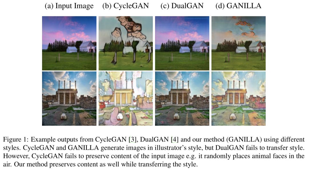 与艺术画或者卡通图片不同,插图虽然也有诸如高山、人物、玩具、树木等这些常见物体,但其抽象程度更高,现有方法很难在风格和内容之间取得好的平衡。如 CycleGAN[3] 虽然能够迁移艺术家的风格,但是无法成功迁移内容;DualGAN[4] 虽然能够保留输入图片的内容,却无法很好的迁移风格。作者通过试验经验性地验证了当前 state-of-the-art 的未配对风格迁移方法也无法为插图提供令人满意的结果,如下图所示。