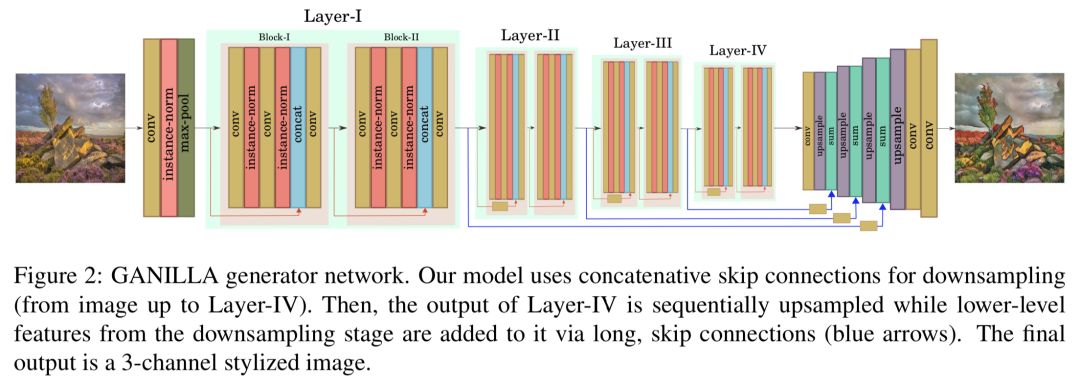 在对图像到插图问题的初步实验中,作者观察到当前未配对的图像到图像的翻译模型 (unpaired image-to-image translation models) 如 CycleGAN[3], DualGAN[4], CartoonGAN[5] 等都无法同时迁移风格和内容。为此作者设计了一种新的生成器网络,能够在保留输入图片内容的同时迁移风格。