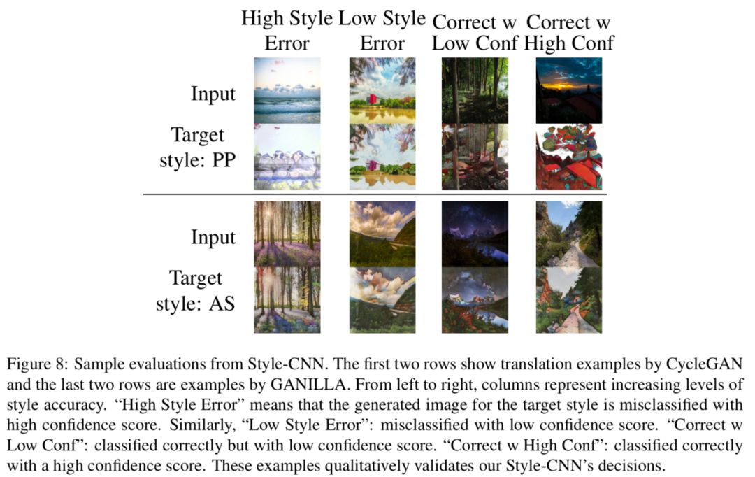 为了定量评价风格迁移的质量,作者提出了风格分类器 Style-CNN,从图像中随机裁取 100x100 大小的像素块,将其送入分类器中进行训练。训练集包含11个类别,包含10个插图艺术家和1个自然图像,如果生成的图像缺乏风格,其更有可能被分类为自然图像。下面图8展示了 Style-CNN 的结果。
