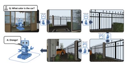 常识信息推理: agent没有一个关于虚拟环境的地图,所以agent需要自行对环境进行探索。因此agent必须自行构建一个常识系统,就像人一样去比较有目的的进行探索房屋(例如一个人接收到一个问题厨具的颜色等,他会根据自己的常识经验直接前往厨房、餐厅等去查看,拿到相应的结果后再进行回答,而不会漫无目的的在房间中摸索)。