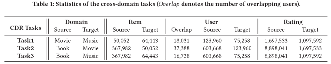我们在亚马逊的公开数据集上构造了三个跨领域推荐任务,具体任务如下表所示: