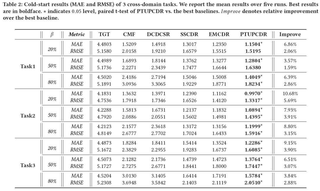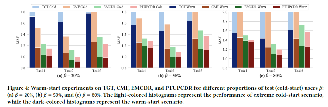此外我们还做了warm start实验,也就是基于这个映射得到向量表示作为初始化,使用后续交互数据微调,得到以下结果,可以看到,针对warm start场景,我们的方法也是很有效的,这也是第一篇同时验证跨领域推荐方法在cold-start和warm-start场景的文章。