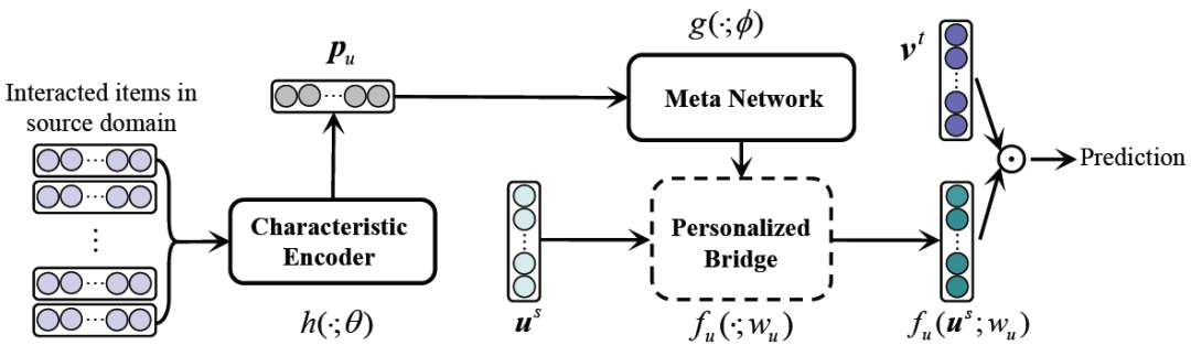 注意,元网络输出的是偏好桥的参数。再将用户在源领域的偏好表示送入预测得到的偏好桥,得到用户在目标领域的偏好表示: