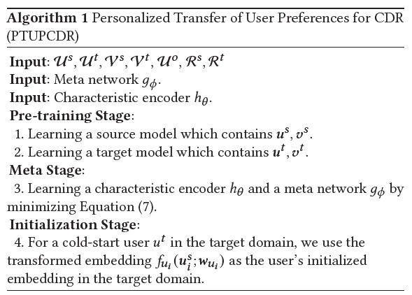 整个训练流程如下所示,先预训练得到源领域和目标领域的模型,再训练元网络,再映射用户兴趣偏好去初始化目标领域上的用户表示: