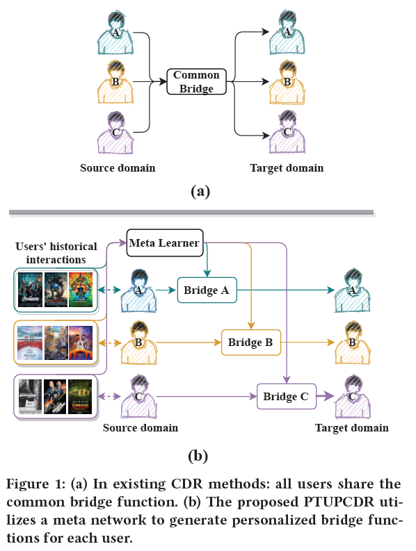 事实上,由于个体的差异,不同领域的偏好间的复杂关系是因人而异的。因此,很难用一个公共的偏好桥来抓获这样复杂多样的关系。为了解决现有方法的不足,有必要使用个性化的桥来建模不同用户的偏好关系。