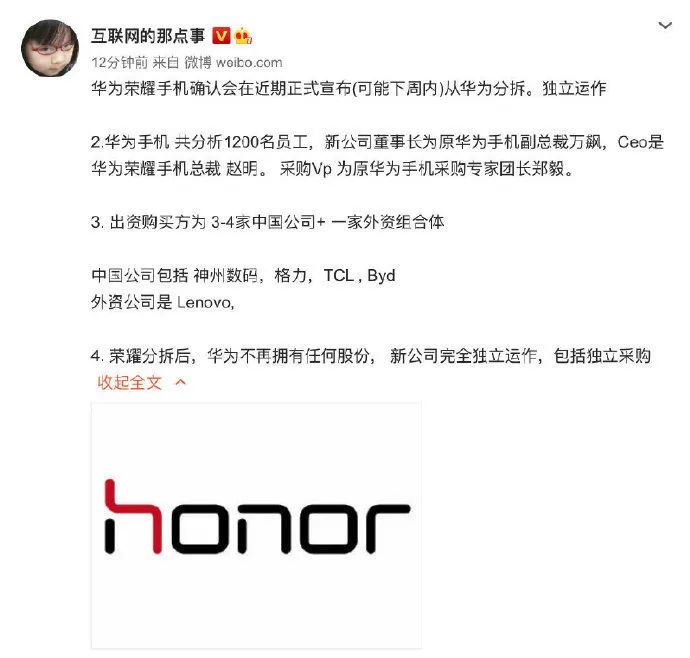 据国内数码博主爆料,华为荣耀手机会在近期正式宣布(可能下周内)从华为分拆独立运作,荣耀分拆后,华为不再拥有任何股份, 新公司完全独立运作,包括独立采购。出资购买方为 3-4家中国公司和一家外资组合体,中国公司包括 神州数码、格力、TCL、Byd、外资公司是 Lenovo? 目前微博已删除
