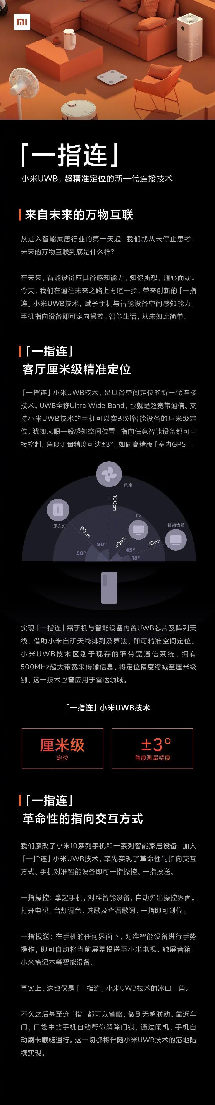 UWB 是新一代的连接技术,能精准感知智能设备的空间位置,就像「室内 GPS 」。超高精度的定位能力,让手机指向智能设备,就能对应呼出控制卡片,甚至对准电视还能直接投屏。无需多余步骤,一指操控。小米结合自研的天线排列及算法,魔改小米 10 手机及小米智能设备,已经实现厘米级定位和 ±3° 的角度测量精度,并推出了「一指操控」和「一指投送」两大创新功能。