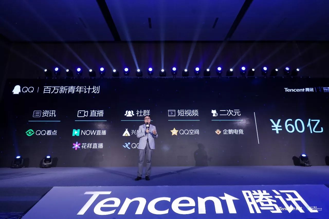 腾讯全球合作伙伴大会QQ论坛2017年11月9日举行,论坛中最值得一提的,是在现场发布的「QQ百万新青年计划」,「QQ百万新青年计划」将会投入60亿资金以及丰富的平台资源,扶持100万名青年内容创作和创业者,让他们可以直接面向用户,助力他们在资讯、直播、短视频、社群、二次元等领域获得成功。
