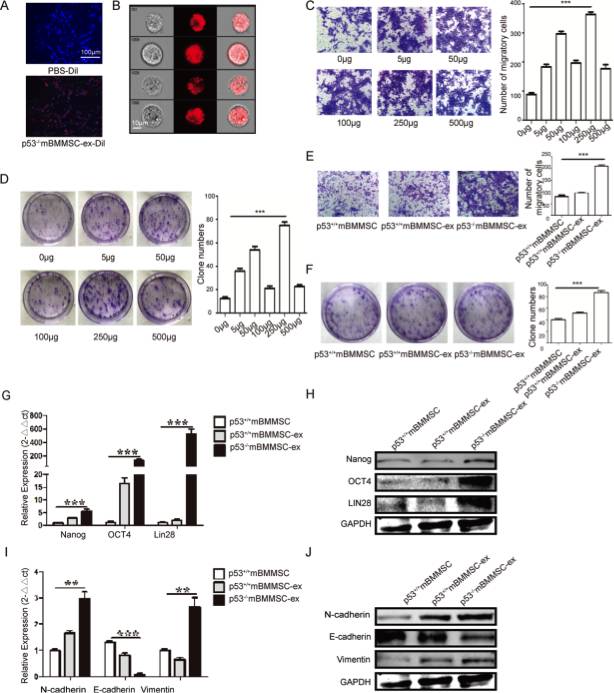 p53–/–mBMMSC外泌体可转移到 (p53+/+mBMMSC) 和MFC,敲除UBR2可抑制p53–/–mBMMSC的增殖、迁移和干性