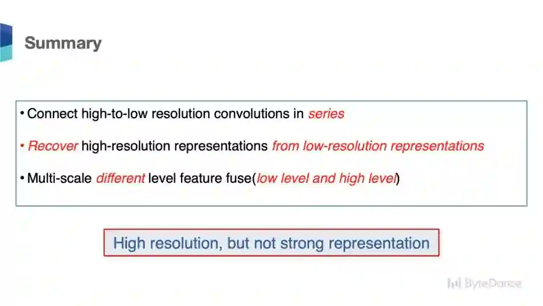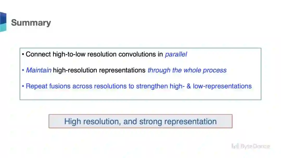 首先,HRNet 的高分辨率特征和低分辨率特征是并行连接。其次,HRNet 始终会学习一个高分辨率的特征表达。最后,HRNet 是通过多次的高分辨率特征和低分辨率特征的交换,来进一步增强高分辨率特征的学习。通过这种方式,HRNet 可以学到更强的高分辨率的特征表达。