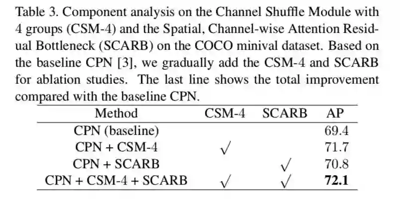 表3 可以看出,在只使用通道交流模块,组数设置为 4(CSM-4)的情况下,在 COCO minival 数据集的结果可以由 69.4 提升到 71.7。在只使用空间通道注意力残差模块的情况下,结果可以由 69.4 提升到 70.8。同时使用两种模块,结果进一步提升到 72.1。