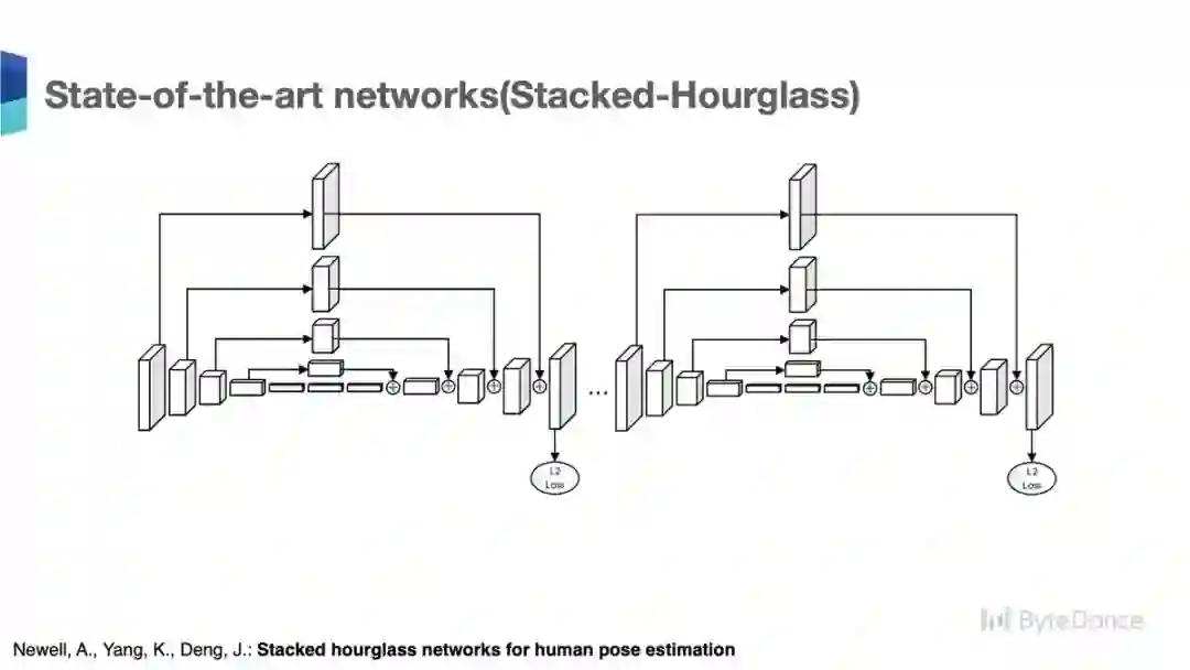 首先,先介绍一下人体姿态识别的经典网络 Stack-Houglass[1],Stack-Hourglass 由普林斯顿大学教授 Jia Deng 团队首先提出,Stack-Hourglass 网路由多个 stage 组成,每个 stage,遵循从低语义高分辨率特征图到高语义低分辨率特征图,然后由高语义低分辨率的特征图通过上采样恢复出高分辨率的特征图的串行结构,同时低语义的高分辨率的特征通过跳连结和深层的恢复的高分辨率融合。