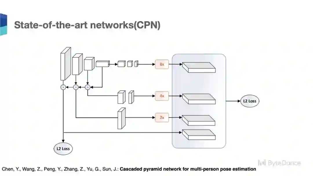在 2018 年,COCO 人体关键点比赛中,旷视团队提出了 CPN 网络(Cascaded Pyramid Network)[2],获得 COCO 人体姿态识别的冠军。CPN 网络使用 ResNet 作为骨干网路,采用了类似特征金字塔的结构来生成高分辨的人体姿态关键点热点图。CPN 主干网路也是遵循从高分辨率特征到低分辨率特征的串行结构,最后通过跳连结构以及上采样操作,得到最终的高分辨率的热点特征图。