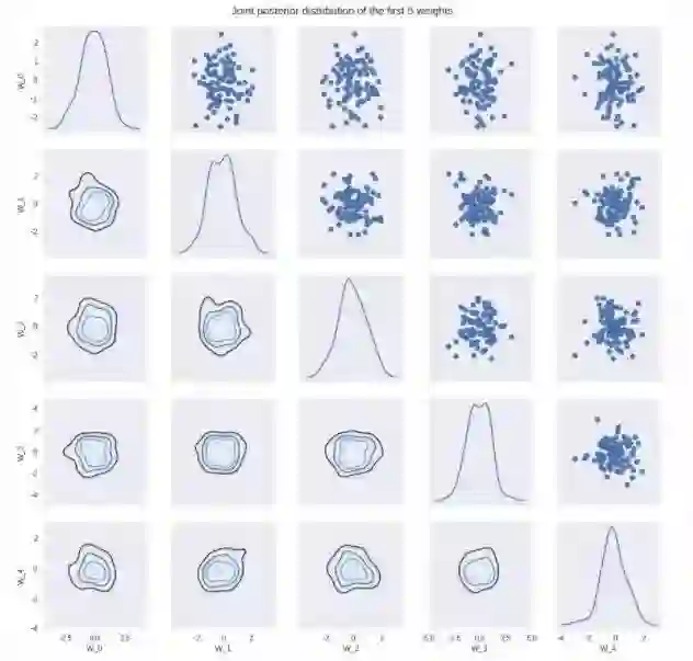 我们还要看一下后验分布。不幸的是,即使是这样的小问题,维度的数量也是相当大的,因此对其进行可视化是非常棘手的!我们选择前5个维度,并产生一个相关性的三角图。