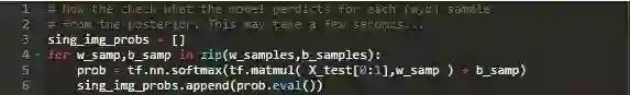 直方图显示对于新分类而言,模型不再拥有之前的置信水平。这就是对比传统的机器学习方法,贝叶斯方法可以添加许多值的地方。这里我们展示的是权重的后验分布可以被用于检验网络对物体进行分类的置信度。