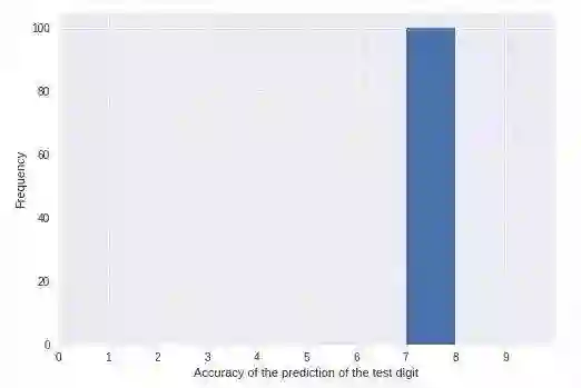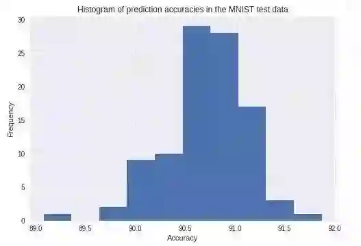 我们获得了一组采样的准确率。注意权重和偏差的后验分布反映了从整个MNIST测试数据获得的信息。因此上述直方图表示来自权重和偏差的统计可能范围的准确率。
