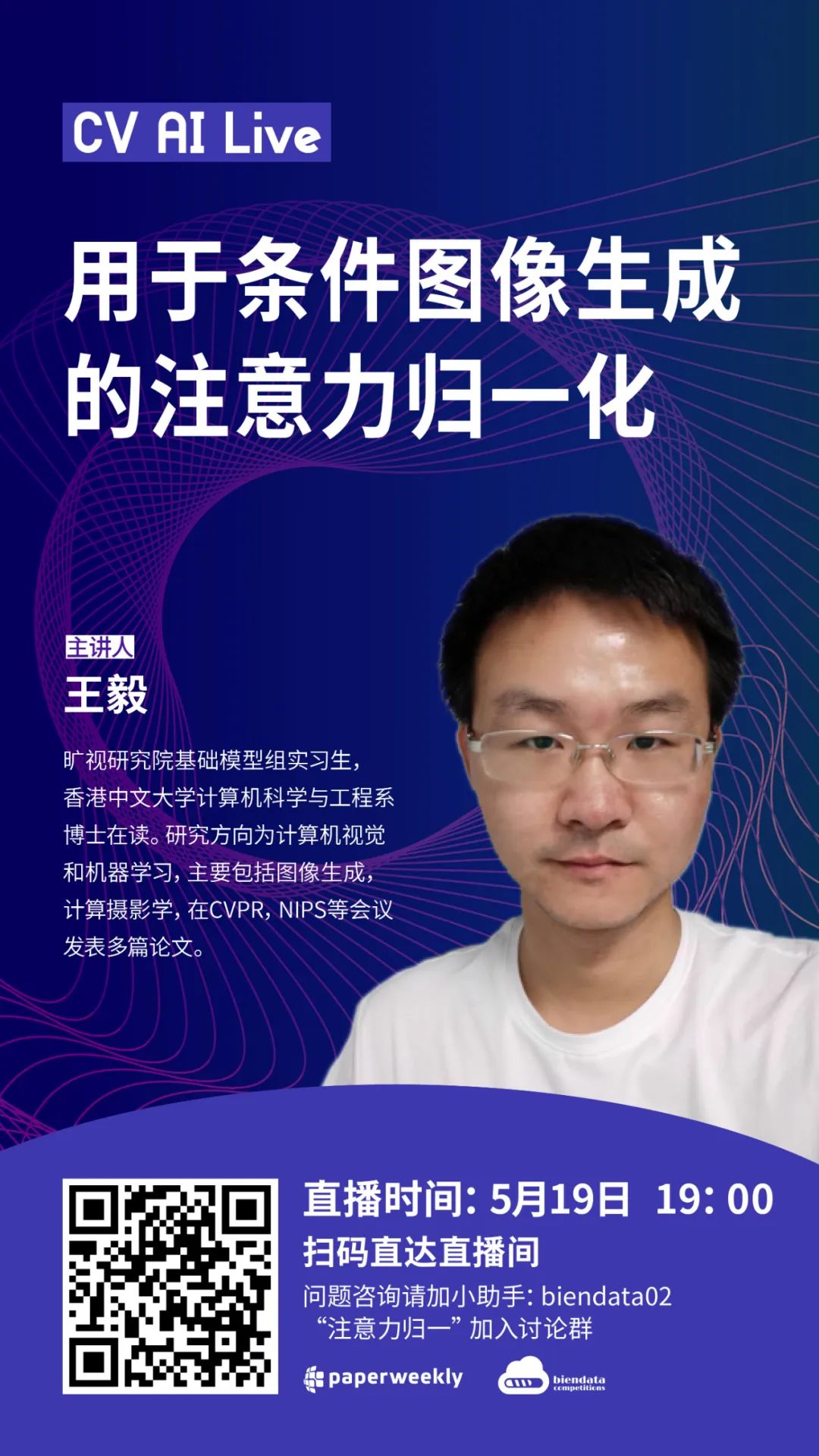 本期 PW Live,我们邀请到旷视研究院基础模型组实习生王毅,为大家带来用于条件图像生成的注意力归一化的主题分享。