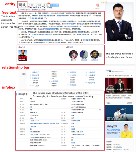 百科数据里包含了大量关于人物的信息,可以作为人物知识图谱的数据基础。下图是一个百度百科页面的展示,可以看到,百度百科中具有多模态、结构化与半结构化的多种数据信息。