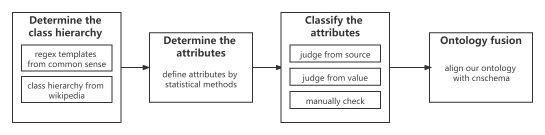 而为了保证数据质量和节约成本,我们半自动地构建了本体。下图说明了本体构建的过程,它包括决定类型层次、决定属性、决定属性类型、本体融合。在本体融合的过程中,我们参考了Cnschema.org。