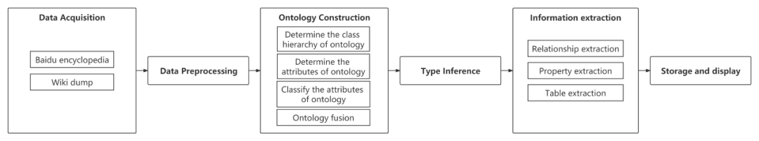 在数据采集步骤中,我们构建了由百度百科中的人物实体和相应的网页组成的人物数据集。在数据预处理步骤中,我们对数据进行了初步的标准化和纠错,并通开放信息抽取预提取了一些三元组。在本体构建步骤中,我们利用维基百科确定了本体的类层次结构和属性。在类型推理步骤中,我们为每个实体分配一个类型。在信息提取步骤中,我们从自由文本和表格中提取关系和属性三元组。在存储和显示步骤中,我们将结果存储在neo4j图数据库中。