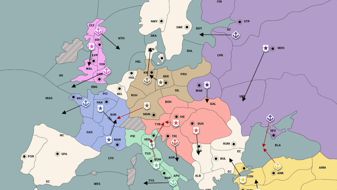 通过对20世纪初欧洲七大国的「角色扮演」,玩家需要与其他选手建立信任、谈判和合作,并尽可能多地占领领土。