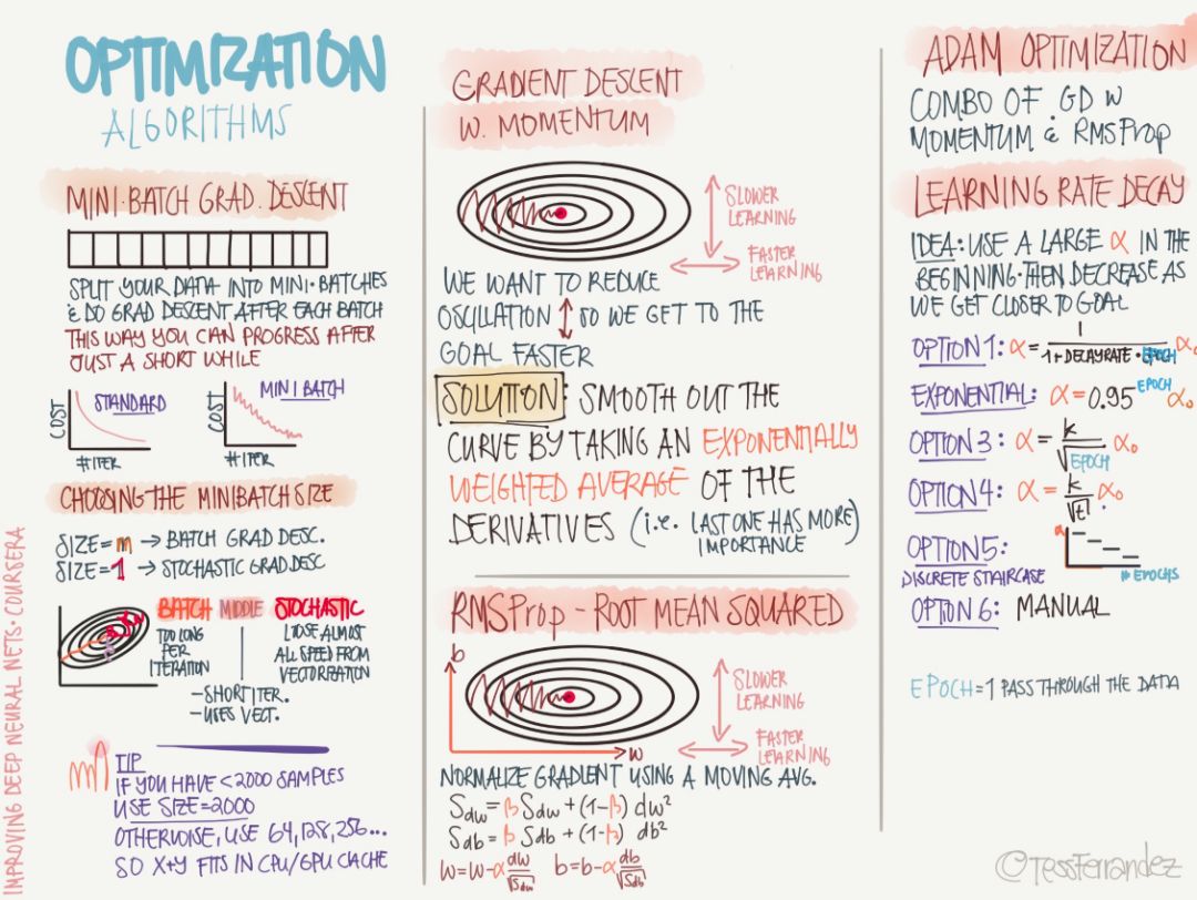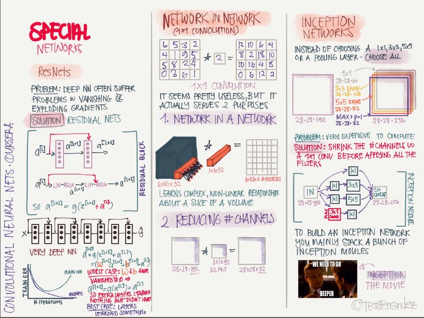 以上是所有关于吴恩达深度学习专项课程的信息图,由于它们包含的信息较多,我们只介绍了一部分,还有很多内容只是简单的一笔带过。所以各位读者最好可以下载该信息图,并在后面的学习过程中慢慢理解与优化。