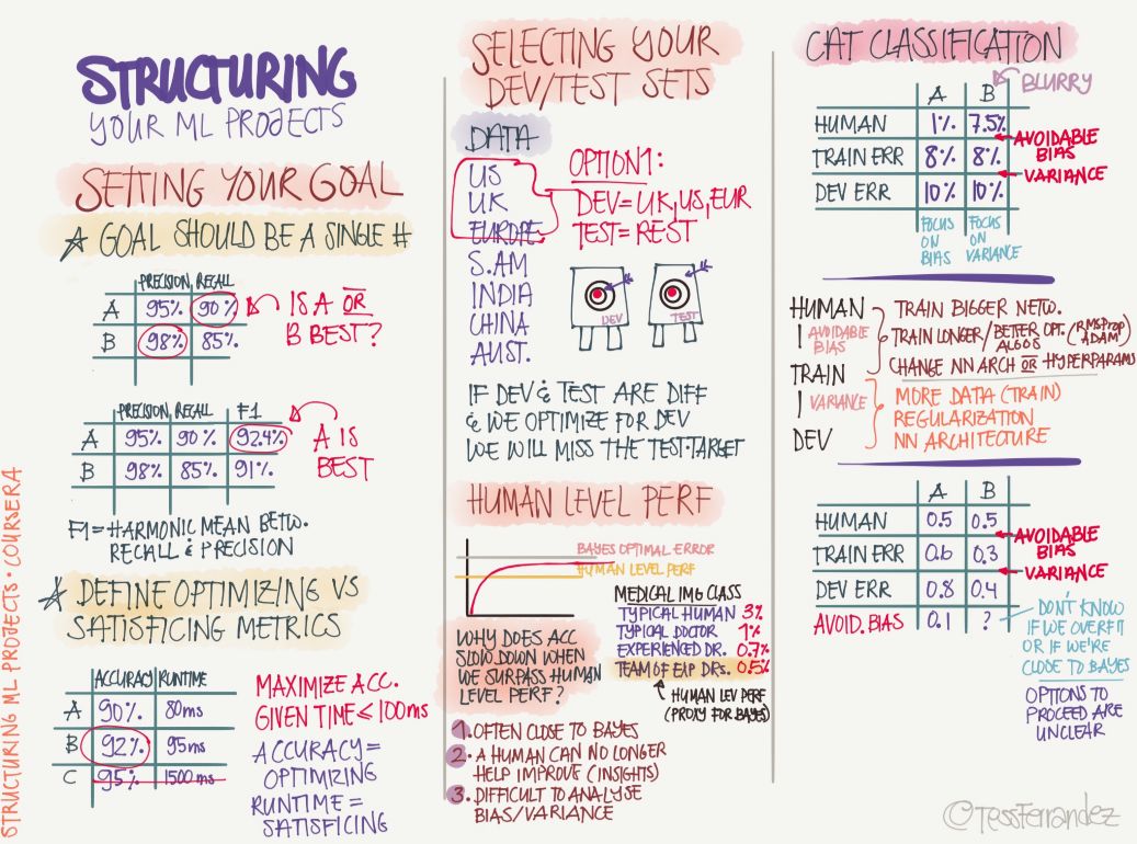 我们需要按过程或结构来设定我们的机器学习系统,首先需要设定模型要达到的目标,例如它的预期性能是多少、度量方法是什么等。然后分割训练、开发和测试集,并预期可能到达的优化水平。随后再构建模型并训练,在开发集和测试集完成验证后就可以用于推断了。