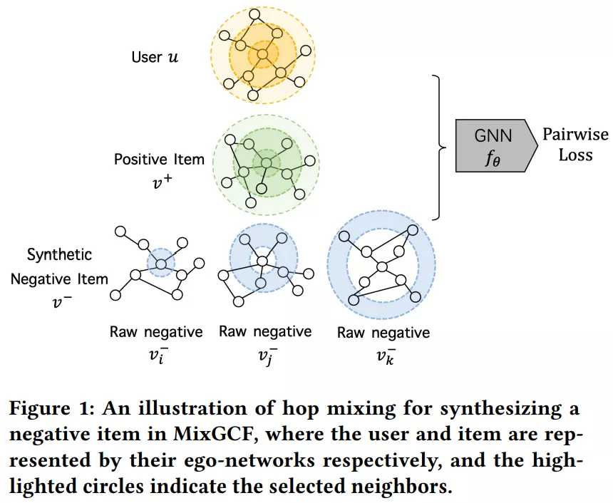 类似 MoCHi [32] 的合成机制,MixGCF [74] 设计了两种策略:正例混合 (positive mixing) 和邻域混合 (hop mixing)。positive mixing 通过注入正例的嵌入使得原始负样本获得正例的表示信息,而 hop mixing 通过 GNN 聚合邻域生成信息增强的负例,在基于图神经网络推荐系统的采样方法中取得了 SOTA 的结果。