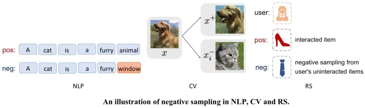 在 NLP 中随机替换连贯句子中的词语、在 CV 中不同图片数据增强的样例,以及 RS 中选择用户未交互的商品,都可以看作是在进行负采样。相关的损失函数有贝叶斯个性化排序损失 (BPR, viz. Bayesian Personalized Ranking loss)、二元交叉熵损失函数 (BCE, viz. Binary Cross Entropy loss) 和对比学习中常用的 InfoNCE loss 等。