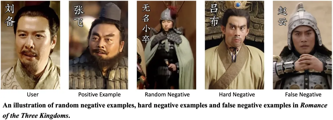 前面的描述可能比较抽象,让我们从《三国演义》的一个例子来具体地体会负例选择的重要性(对《三国演义》不太熟悉的读者可以依次代入四郎、甄嬛、静白、浣碧和纯元,或者贾宝玉、晴雯、刘姥姥、多姑娘和林黛玉)。