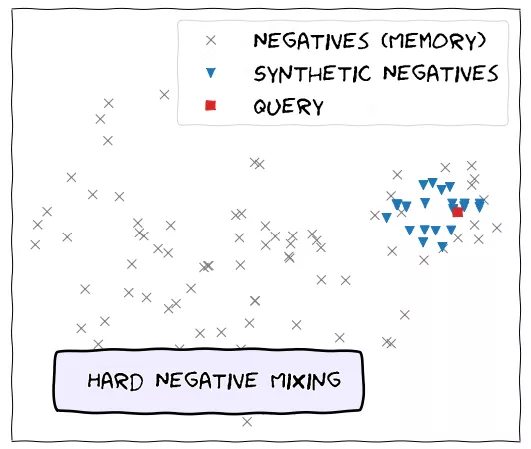 答案是可以的,MoCHi [32] 在对比学习的任务中直接合成强负例,通过 Hard Negative Mixing 的方式融合了现有强负例与 query 的表示,从 embedding 空间得到了更能为训练带来增益的负例。
