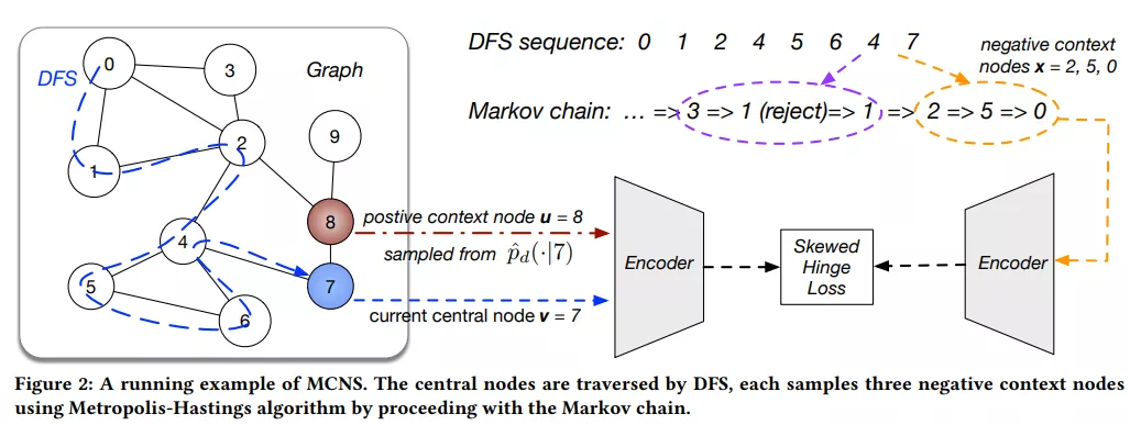 马尔可夫链蒙特卡罗负采样(MCNS)[72] 是从理论上分析负采样在链路预测中的影响的先驱。基于推导出的理论,MCNS 提出通过近似正分布来对负样本进行采样,根据图上的结构相关性重新设计正负例的样本分布,并通过 Metropolis-Hastings 算法加速该过程。