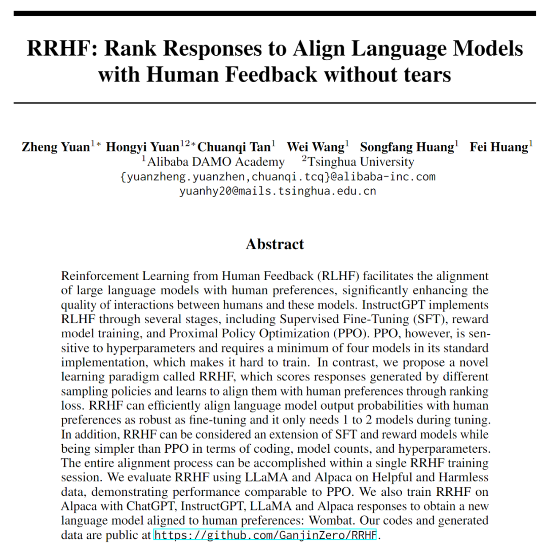 RRHF 算法可以有效地将语言模型输出概率与人类偏好对齐,并且在微调期间只需要 1 到 2 个模型。相比之下,PPO 需要 4 个模型:微调的语言模型,参考语言模型,奖励模型和价值模型相互配合。在实际的训练中,更少的模型数量可以帮助减少显存的占用,使得 RRHF 可以更高效地利用计算资源,并扩展到更大规模的模型上进行训练。