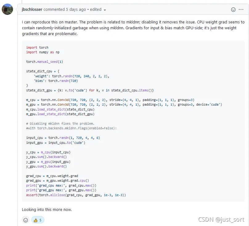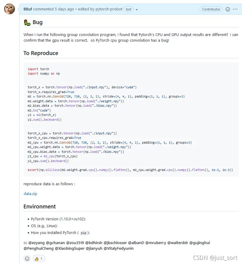 赶紧整理出了复现代码给PyTorch提了issue:https://github.com/pytorch/pytorch/issues/68868 。
