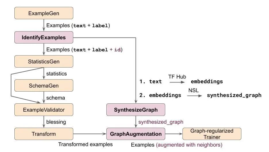 在此图中,仅有自定义组件(粉色)与计算图正则化的 Trainer 组件具备 NSL 相关逻辑。值得注意的是,此处展示的自定义组件仅作例证,还可以通过其他方式构建类似功能的流水线。接下来,我们进一步详细描述各个自定义组件,并展示相应的代码段。